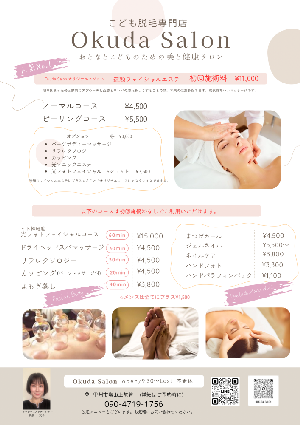 | ・スペシャルフォトフェイシャルコース¥15,000 ・ドライヘッドスパ ¥4,500 ・リフレクソロジー ¥4,500 ・腰ヒップマッサージ ¥4,500 ・カッピング ¥4,500 ・よもぎ蒸し 30〜40分 ¥3,800 |